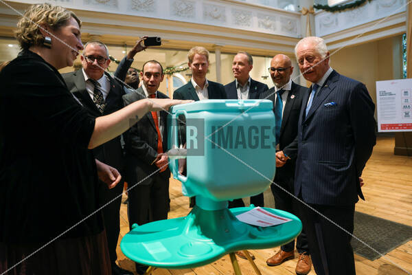 Caption: King Charles III looks at a hand washing station during a visit to St Peter's Church in Notting Hill, London, to meet and thank DEC staff, aid workers and volunteers. The Church has supported the Middle East Humanitarian cause through Tearfund, a DEC member charity