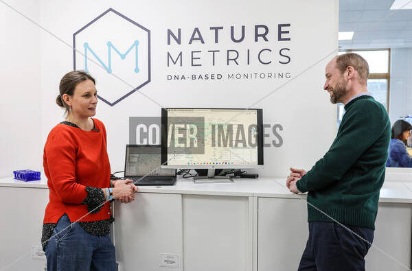 Caption: The Prince of Wales talks with Dr Kat Bruce founder of nature metrics as they look at DNA samples extracted from areas around the world, during a visit to 2024 Earthshot Prize finalist, NatureMetrics, in Guildford, Surrey, a UK based nature company which enables companies to measure and report on their impact on nature and ecosystems