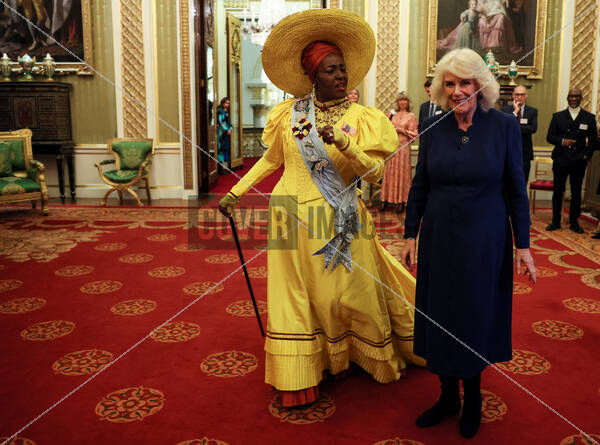 Caption: Queen Camilla walks with actor Sharon D Clarke as she hosts a reception for staff, actors and supporters to celebrate the work of the National Theatre on stage, screen and in schools at Buckingham Palace, London