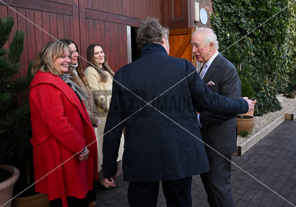 Caption: King Charles III is greeted by Tower Brewery owner John Mills, his wife Karen Mills, and daughters Grace and Annabel during a visit to Tower Brewery in Burton Upon Trent, Staffordshire, an independent, family run small brewery that has been in the local area for twenty four years.