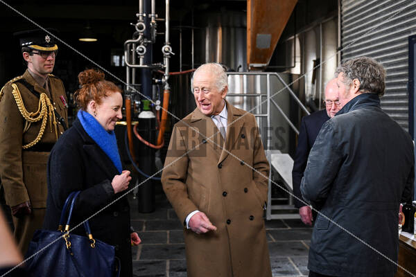Caption: King Charles III reacts following his visit to Tower Brewery in Burton Upon Trent, Staffordshire, an independent, family run small brewery that has been in the local area for twenty four years.
